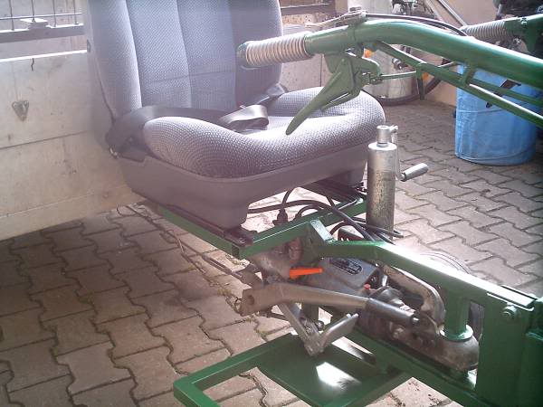 Die Fußauflage werde ich noch modifizieren, von vorne gesehen einen erhöhten Rahmen angringen, nach unten vollflächig schließen, soweit es das Stützrad erlaubt. Da die Fußstütze sehr tief liegt, besteht die Gefahr, dass man sich beim Überfahren von Ästen, Steinen und Wurzelstöcken die Füße verletzt oder gar abschert.