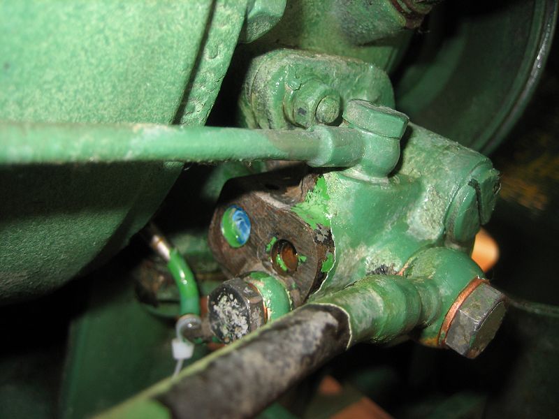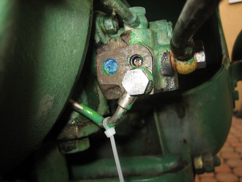 Wenn man vom Fahrersitz auf die Pumpe schaut, dann sind da zwei Bohrungen, die nicht angeschlossen sind. In der einen Bohrung ist eine blauer Propfen drin. Wenn man von oben auf die Pumpe schaut, dann ist da ein ganz kleines Loch, aus dem etwas austritt. Entweder Öl oder Öl mit Diesel vermischt. Es reicht auf jeden Fall nach Diesel.