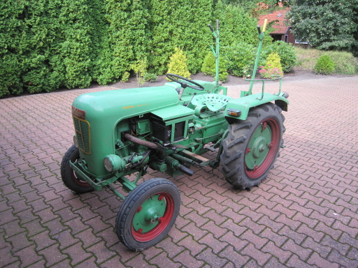 Der Traktor befindet sich im Originalzustand. Original- Lack. Fahrzeugbrief vorhanden. Mit dabei sind ein Mähwerk, ein Pflug (bestehend aus zwei Teilen) und ein Satz Zwillingsräder. Diverse Kleinteile vorhanden.
