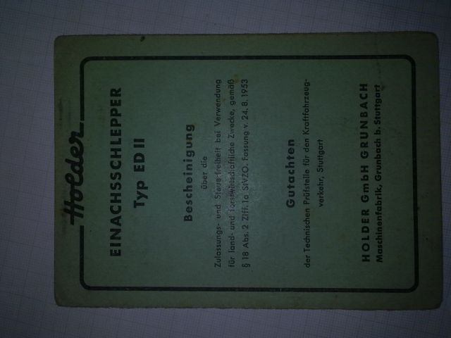 Ich habe einen Holder EDII abzugeben. Er ist mit Pflug und der "Bescheinigung über Zulassungsfreiheit" (also BE). Baujahr ist 1956.
