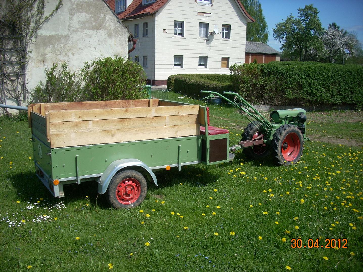 Dabei ist ein gebremster Anhänger, ein Pflug eine Egge und ein Kartoffelroder.